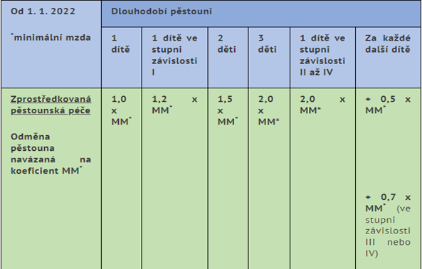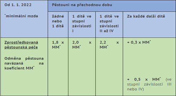 Výpočet výše odměny pěstouna je navázán na koeficient minimální mzdy v závislosti na počtu svěřených dětí, jejich zdravotním stavu a typu pěstounské péče (dlouhodobá x přechodná).